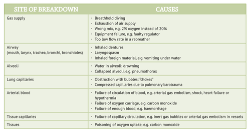 - The brain is affected first! With severe hypoxia, sudden unconsciousness occurs, e.g. ascent after breath hold diving. With lesser hypoxia, confusion, headache, fatigue, apathy, overconfidence, blurred vision, slurred speech, vertigo, stupor, etc. may occur.