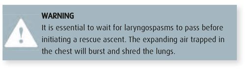 The same applies to a convulsing diver. During a convulsion, the diver is not breathing, the jaws are clenched and if the mouthpiece is bitten through or free in the water, the first inhalation after the convulsion passes will cause water inhalation and immediate laryngospasm. It is essential to wait for laryngospasm to pass before initiating the rescue ascent.