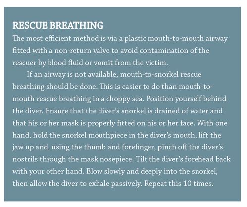 - Rescue the diver from the water, with stops for rescue breathing every 15 seconds. If you see help is on the way, stay where you are and give continuous rescue breathing.
