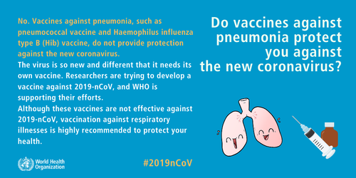 No. Vaccines against pneumonia, such as pneumococcal vaccine and Haemophilus influenza type B (Hib) vaccine, do not provide protection against the new coronavirus. The virus is so new and different that it needs its own vaccine. Researchers are trying to develop a vaccine against 2019-nCoV, and WHO is supporting their efforts. Although these vaccines are not effective against 2019-nCoV, vaccination against respiratory illnesses is highly recommended to protect your health.