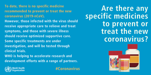 To date, there is no specific medicine recommended to prevent or treat the new coronavirus (2019-nCoV). However, those infected with the virus should receive appropriate care to relieve and treat symptoms, and those with severe illness should receive optimized supportive care. Some specific treatments are under investigation, and will be tested through clinical trials. WHO is helping to accelerate research and development efforts with a range or partners.