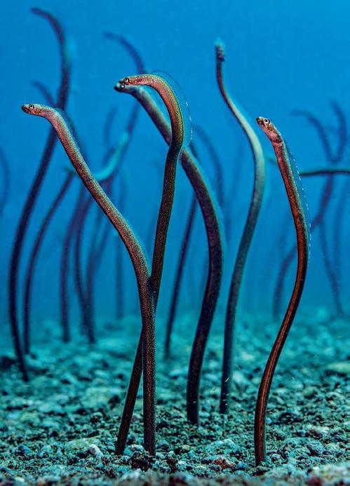 The guides I dive with in Dauin are brilliant spotters but leave the animals be and instantly step in if they see a guest overstepping the line. For the next 40 minutes we pass the time with a pink painted frogfish,hairy frogfish, a trio of roughsnout ghost pipefish and then, with about 10 minutes left, the star of the show — a blue-ringed octopus. This highly venomous cephalopod is always a treat to see, prowling the seafloor with an assurance that comes from such artillery. This one is a large individual, and we return several more times during our trip to find it out and about in the same area. Blue-ringed octopuses of all sizes are regular treats, and other sites produce longarm octopuses and flamboyant cuttlefish. Night dives are full of bobtail and bottletail squid resting on the seabed that rapidly cover themselves in the sediment should a diver fail to use red light when viewing them.