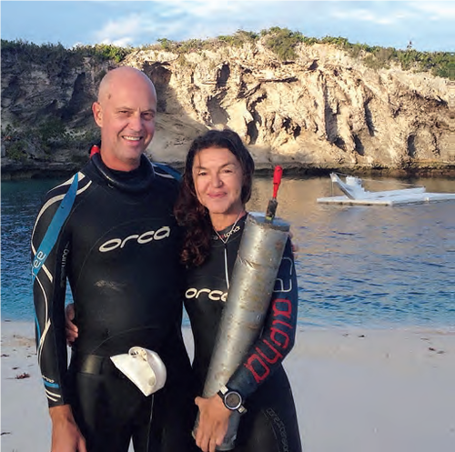 With our float and drop line, we take a few steps before we are suspended over the deep blue. The sandy ledge behind us funnels into beautiful sand falls. With a few more kicks we cross the opening of the hole and can see the hydrophone below the first ledge. The resident barracuda has already come to greet us. I signal to my husband and dive buddy, Ricardo, to let him know I will dive first. I am already feeling good because we did our stretching and breathing exercises early this morning. Now I need a few minutes to relax and prepare for our first reconnaissance dive. I take my peak inhale, bend and begin my slow vertical descent. I know how many kicks it takes to pass the first ledge. I flatten out and face the hydrophone.