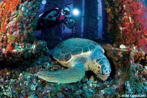A loggerhead turtle rests on a gas platform, where it finds plenty of sponges to eat.