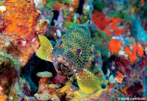 FGBNMS hosts 260 species of bony fish. That may not seem special, but the number of unusual fish found there is impressive. The odd, triangular, smooth trunkfish is typically black with white spots, but a variation found only at FGBNMS has a brilliant golden body with black and white spots. The cause of the color variant is unknown. Both blue and queen angelfish are abundant here, and the two species do more than mingle. They produce a hybrid called the Townsend angelfish, which has a variable mix of traits from its two parent species. The Mardi Gras wrasse, which features colorful body patterns reminiscent of its namesake, was first identified as a new species in 2008 and is found only in the sanctuary and some of Mexico’s reefs near Veracruz. You can also see the interesting and somewhat unusual knobbed porgy, yellowtail reeffish and tusked goby.