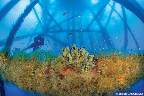 Diver Vivian Dunlop gazes at a gas platform that hosts a thriving community of marine life.
