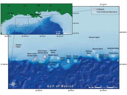 In January 2021, NOAA released its Final Rule to the Federal Register specifying the sanctuary expansion from three reefs and 56 square miles to 17 reefs and 160 square miles. The expansion and its protective restrictions took effect on March 22, 2021. The expanded sanctuary is like a necklace of connected bank boundaries that stretches across the Outer Continental Shelf. Of the 14 new sanctuary banks, three have reef caps within recreational dive limits, but the tops of two of the three are close to 130 feet.