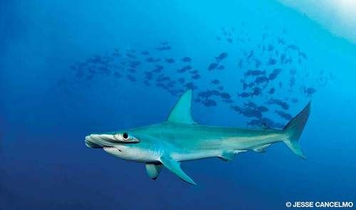 A scalloped hammerhead shark cruises the blueway off Stetson Bank’s north dropoff.