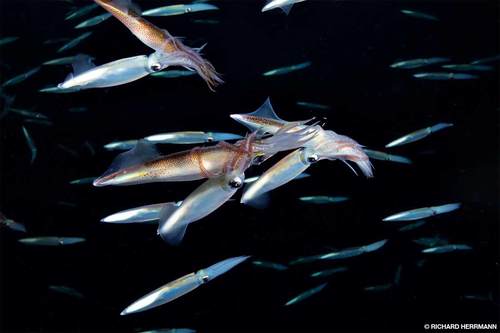 Male squid wrap their tentacles around females during a night dive at Catalina Island. Photo by Richard Herrmann