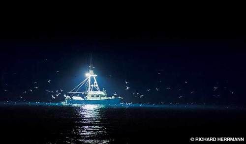 Commercial boats use very bright lights at night to attract and concentrate the squid for a form of net fishing called purse seining. Large seiners have lights mounted above the wheelhouse and work in conjunction with small, specialized “light boats” to get the squid to come to the surface so fishers can efficiently net them. When market squid rise to the surface it is called a float. The surface will be thick with thousands of squid that look bright white under the lights during a good float. Film crews and dive boats have success with methods of squid attraction similar to those the fishing industry uses.