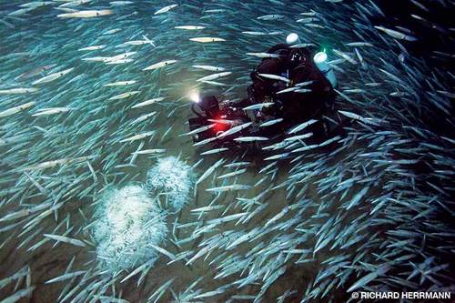 As you drop into water as black as night, thousands of pulsating squid in search of mates suddenly surround you. Mating activity is everywhere as multiple males attack single females. The excited squids’ chromatophores (pigment cells) flash colors reminiscent of a Las Vegas neon sign and put you in the middle of a living, moving light show. The action is so frenetic that animals are in your gear and bounce off every inch of your body.