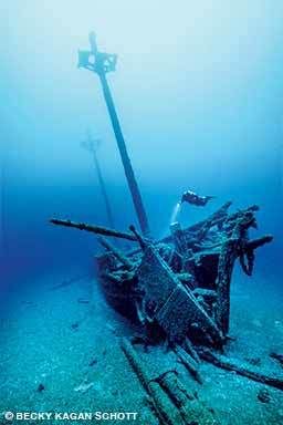 During my time there, I met passionate archaeologists from the sanctuary and spent a lot of time at the beautiful museum in Alpena. Their enthusiasm for protecting the resources and educating the public was infectious. After I left, I couldn’t get the wrecks out of my mind; later that year, when the water warmed to at least 38°F, I revisited the sanctuary. The perfectly preserved wooden wrecks and schooners were irresistible draws. Sitting on the bottom with their masts standing straight, they look as if they are still sailing. In my mind this was how shipwrecks should always look.