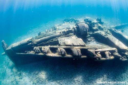 The Typo was a three-masted wooden schooner that sank after a collision on Oct. 14, 1899. It sits upright with the bowsprit intact and all its rigging in place. As you descend toward the wreck, a mast protrudes from the dark depths at around 100 feet. Upon reaching the wreck at 170 to 195 feet, you’ll see the windlass and two wooden stock anchors stowed on the bow railings before encountering the ship’s bell. Not many bells remain on shipwrecks, so it’s exciting to see one. The bowsprit is stunning, and if you descend into the sand to look up at it, it almost looks like something from a movie set. Fallen masts, deadeyes, pulleys and other rigging are on the deck. The Typo was carrying coal when it was struck, and it went down hard and fast. The stern bears the impact damage, and coal litters the lake bottom. Many artifacts are in the coal piles, including the remains of the four crew members who went down with the ship. Divers are respectful and do not disturb them.