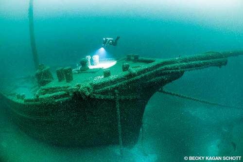 These are natural shipwrecks, many of them wooden, and the cold, fresh water has preserved them. They would not be intact or possibly even exist if they were in salt water. Diving here is like being inside a time capsule. The wrecks are irreplaceable, so it’s important not to damage them, and it’s illegal to remove any artifacts from the sites. As a photographer I enjoy descending to a shipwreck and seeing the wooden wheel in place, a bell, a galley full of teacups and plates, and personal belongings such as binoculars and clothing still there. Each wreck has an extraordinary story and history to tell through its remaining artifacts.