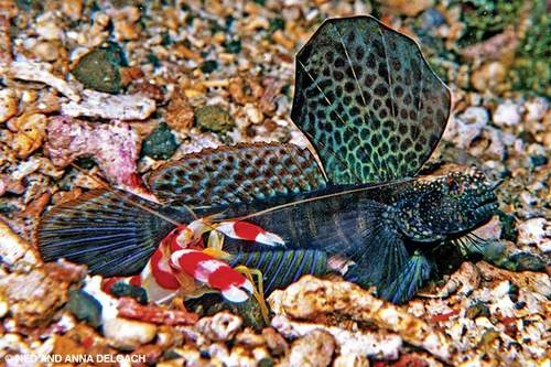 Don’t forget the gobies. The closer you approach, the more magical they become. While the majority wears sensible camouflage wardrobes, others display bold colors and sport high, handsome fins as if taunting predators to attack. It seems these flashier shrimpgobies, including several of our favorites pictured here, are among the most difficult to approach. But, as things turned out, one of the least-elegant species proved to be the most compelling.