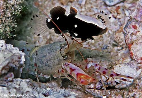 A mated pair of shrimp and a single guardian goby typically share a burrow. During breeding season, the number increases when neighboring female gobies come courting and leave behind clutches of eggs for the males to keep safe.
