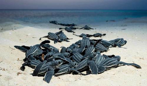 Divers do not often encounter olive ridleys, as these turtles do not frequent coral reefs but usually feed either in soft-bottom areas or in open ocean. However, they can be viewed on shore in one of nature’s greatest spectacles. While other types of sea turtle may share preferred nesting beaches with other members of their species, the act of nesting is a solitary event; not so with the two species of ridley turtles, which coordinate their nesting in mass events known as arribadas. During an arribada, which may last for days, hundreds of thousands of female turtles may come ashore on a single stretch of beach with hundreds or thousands digging nests simultaneously. Eggs may go flying through the air as turtles dig up nests previously laid by other turtles.