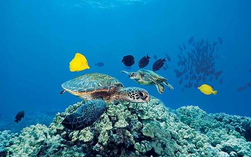 Green sea turtles (Chelonia mydas) are cleaned of algae by yellow tangs and goldring surgeonfish (also known as kole tangs) near South Kohala, Kona, Hawaii.