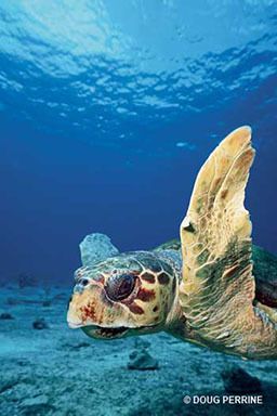 The third species of sea turtle likely to be seen by divers is the loggerhead. The big, blocklike head of this species distinguishes it immediately from other sea turtles and provides a clue about its feeding habits. While the serrated jaws of the green turtle are designed for snipping off blades of grass and strands of algae, and the sharp, narrow beak of the hawksbill is well adapted for reaching into crevices in the reef to scrape off sponges, the massive jaws of the loggerhead enable it to crush shelled invertebrates such as crabs, lobsters, scallops, conchs and urchins. An adult loggerhead can crack a thick conch shell that is difficult to chip with a hammer.