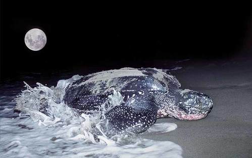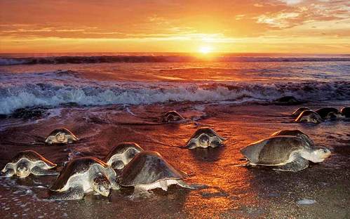 Female olive ridley sea turtles (Lepidochelys olivacea) come ashore at sunset to nest during an “arribada” (mass nesting event) at Ostional, Costa Rica.