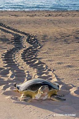 I eventually succeeded in photographing green turtles mating in stacks of two, three and even four. Male sea turtles are rarely discouraged by the fact that another male has already mounted a female. Green turtles have distinguished their species not only with the longest recorded fornications but in many other aspects of their lifestyle and biology as well. Green turtles are the only sea turtles that are primarily herbivores as adults. On a diet consisting mostly of seagrasses and algae, they grow to the second largest size of any sea turtle, achieving a maximum weight of 517 pounds. They are also the only sea turtles that spend time ashore (beyond the time spent by egg-laying females). In a few locations and for reasons that have not been fully elucidated, green turtles of both sexes regularly drag themselves up onto the beach and spend hours basking on dry land.