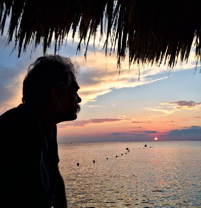 Wall watches the sunset from shore.