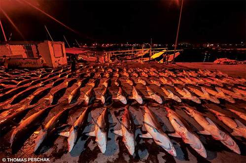 Globally, shark populations have declined dramatically over the past century; some regional studies report declines of more than 90 percent for some species. Oceans without sharks would be like Yellowstone without bears or the Serengeti without lions. This photo shows a single boat’s catch of silky sharks laid out in an orderly grid. The angular puzzle of fins pointed to the sky resembles crosses in a military cemetery.