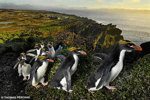 Macaroni penguins climb toward the summit of a sea cliff. This unique penguin nesting and molting site is along the western edge of Marion Island. Despite being nearly 1,200 miles southeast of Cape Town, Marion is South African territory and has an important scientific research station.