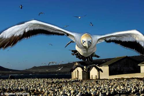 A cape gannet flies low over Malgas Island, trying to land as close to its partner and nest as possible. If the bird lands too far away, it will have to run through the crowded colony, enduring a gauntlet of stabbing beaks. These gannets can get intense and vicious when dealing with interlopers.
