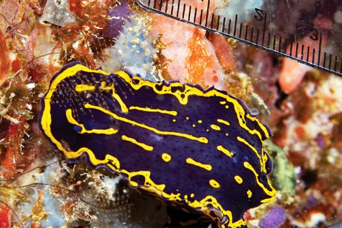 MY FELLOW DIVERS WERE ECSTATIC AFTER A TWILIGHT DIVE on the Okinawa wreck near Pompano, Florida, in early June 2019. I was shooting wide angle and hadn’t paid much attention to small creatures during the dive, but they had found the holy grail for macro photographers: nudibranchs — in this case, regal sea goddesses (Felimare picta), which are giants among the sea slug species.