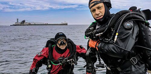 Divers Jim Eckhoff and Keith Flood exit the water after diving the Norman in Lake Huron, Michigan. Photo by Jitka Hanakova