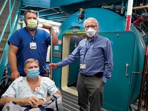To be thorough, the doctor ordered an MRI that evening to evaluate the area where the DCS hit affected me. I had a third chamber ride — the shortest yet — the following day, along with seven other patients receiving medical hyperbaric treatment. I was impressed with the hyperbaric capacity and capability available at Duke. The chamber I was in that morning could accommodate eight patients and two attendants. After the third ride, the dive doctors released me. My symptoms were about 85 percent resolved by then, which the doctors assured me was normal. They said I would see continued improvement over the following weeks and months.