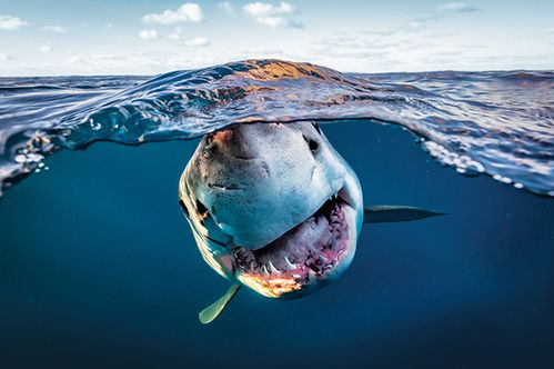 I wanted to shoot a split waterline image of a great white shark, and on this day at the Neptune Islands in South Australia, I got my chance. The wind had dropped off, and in the evening the ocean was glass. I needed a calm shark to avoid risk to myself or the animal while pulling off this image. This shark circled near the boat’s stern for half an hour. It displayed relaxed body language, so I attempted the shot. Shortly after placing my pole-mounted camera in the water, the shark showed some interest and cautiously approached. I quickly fired a sequence of frames before safely pulling the camera out of the shark’s way.