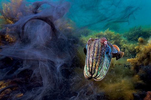 The annual giant cuttlefish aggregation is a wonderful and unique event in South Australia. From May to August an estimated 250,000 cuttlefish gather around Point Lowly off the small industrial town of Whyalla to fight and breed. It’s a spectacle that every diver should experience at least once. Moments before this frame, I had observed three large males trying to court a single female. As I approached, a fight broke out between two males, and they inked the water as they furiously grappled each other. Their fight rolled out of frame, the female bolted, and this one male was left in the aftermath, still displaying his vivid courting colors.