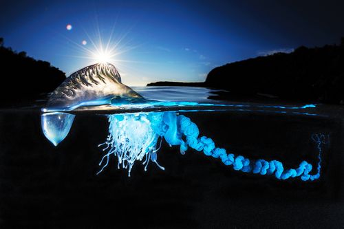 SOMETIMES A SINGLE CLICK OF THE SHUTTER release can change a career trajectory. That’s what happened in 2014 after Matthew “Matty” Smith won a category in the London Natural History Museum’s prestigious Wildlife Photographer of the Year Award. He was aware of the stinging cnidarians known as bluebottles (Physalia utriculus)from a lifetime of surfing. Colonies of them sweep along Sydney, Australia’s beaches in summer. Matty had the idea of photographing them using a close-focus, wide-angle technique. They aren’t very large — the floats rarely get larger than 6 inches — so to make it appear impressive in the photo, he had to work very close and use perspective distortion to his advantage. Because the long tentacles dangling underwater are critical to the illustration, his idea was to shoot an over/under using a dome port on a camera housing to capture the above and below in a single frame.