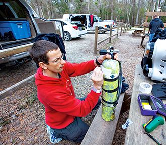 Stage cylinders allow divers to increase penetration distance in an overhead environment, such as a cave, wreck, or mine. Divers breathe from cylinders that they place at predetermined intervals along their path. Some divers drop these cylinders based on pressure, while others drop them based on time. While making their way out, divers pick up the cylinders and use them. Regardless of the divers’ gas management method, all team members must agree on a procedure before commencing the dive.