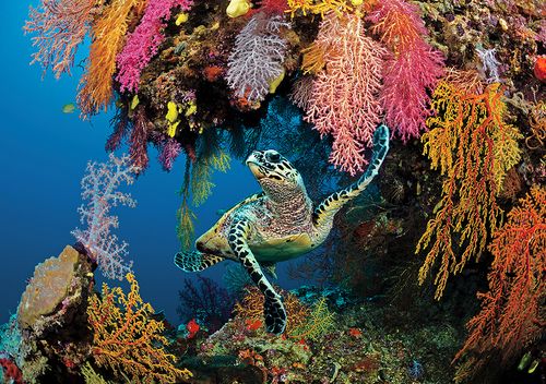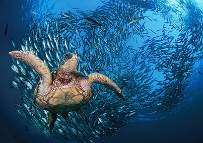 Turtles are often so focused on the task of feeding that you can have a closer encounter. Be aware of their demeanor as you approach, and take your time so they can trust your intentions. Feeding hawksbills are wonderful subjects for images and even more so for video. They will often move rocks and coral to get to the right sponge, allowing you to see them crunch into a meal using their extremely long necks and birdlike beaks. Green sea turtles, on the other hand, have a less protrusive mouth with a serrated jaw for their herbivore diet.