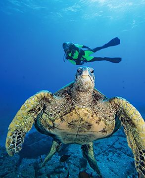 There is no wrong lens for photographing sea turtles, but a wide-angle zoom lens is most photographers’ go-to choice. In many locations it is happenstance to encounter a turtle, so you can make it work with whatever lens you have. I have shot turtle face portraits with a 100mm macro lens and used a full-frame fisheye lens to capture reef scenes that include a turtle. A fisheye lens tends to distort the turtle the closer you get, so pay attention to your composition when using one.