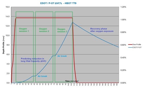 P-OT is typically measured in terms of the reduction in lung vital capacity (ΔVC), brought about by damage and inflammation to the alveolar membranes. The US Navy oxygen exposure limits require no more than a 2% reduction in Vital Capacity and no more than a 10% decrement as a maximum limit. Using these limits, the Arieli methodology helps define oxygen exposure and time frameworks that we can adhere to in minimising risk.