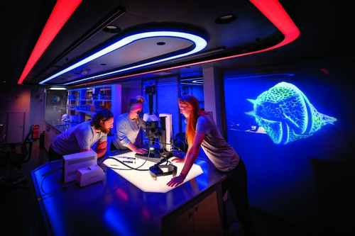After 11 years, Dalio and Mark were ready to commission a new ship, the OceanXplorer, with four times the capacity of Alucia. The ship’s statistics are impressive: 286 feet (87.1 m) long, a maximum crew of 72, four wet and dry labs for tasks such as genetic sequencing and microscopy, media facilities including digital imaging capture and editing, and a recompression chamber. It’s the most advanced scientific research, exploration, and media production vessel ever built. Cameron and production designer C. Page Buckner consulted on the Hollywood-quality production facilities.